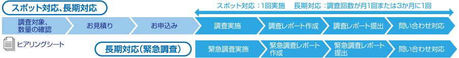 スポット対応、長期対応のサービスの流れは以下のとおりです ※緊急調査は長期対応にのみ含まれます